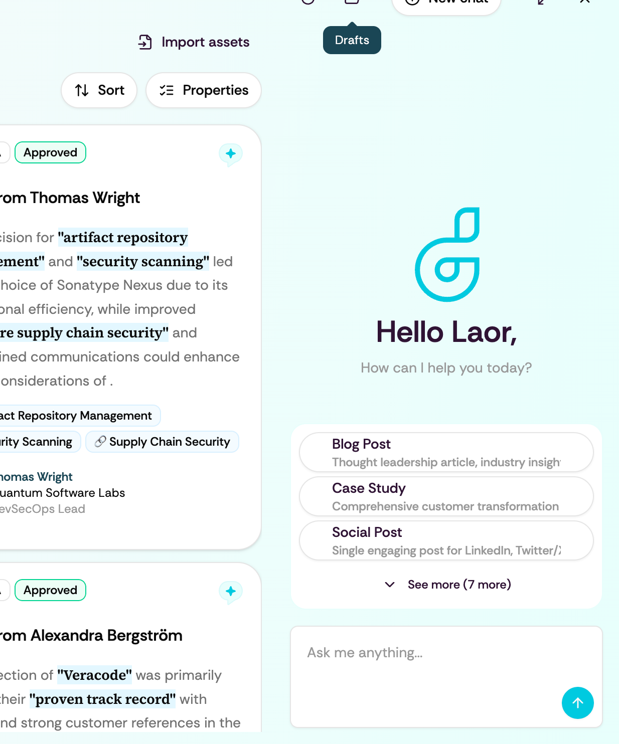 Query anything: Instead of manually filtering and searching, just ask. "Show me all testimonials from enterprise healthcare customers who mentioned ROI." "Which references have spoken about our implementation process?" "Find quotes about security compliance”, “What are the 3 main reasons customers chose us over X competitor?."