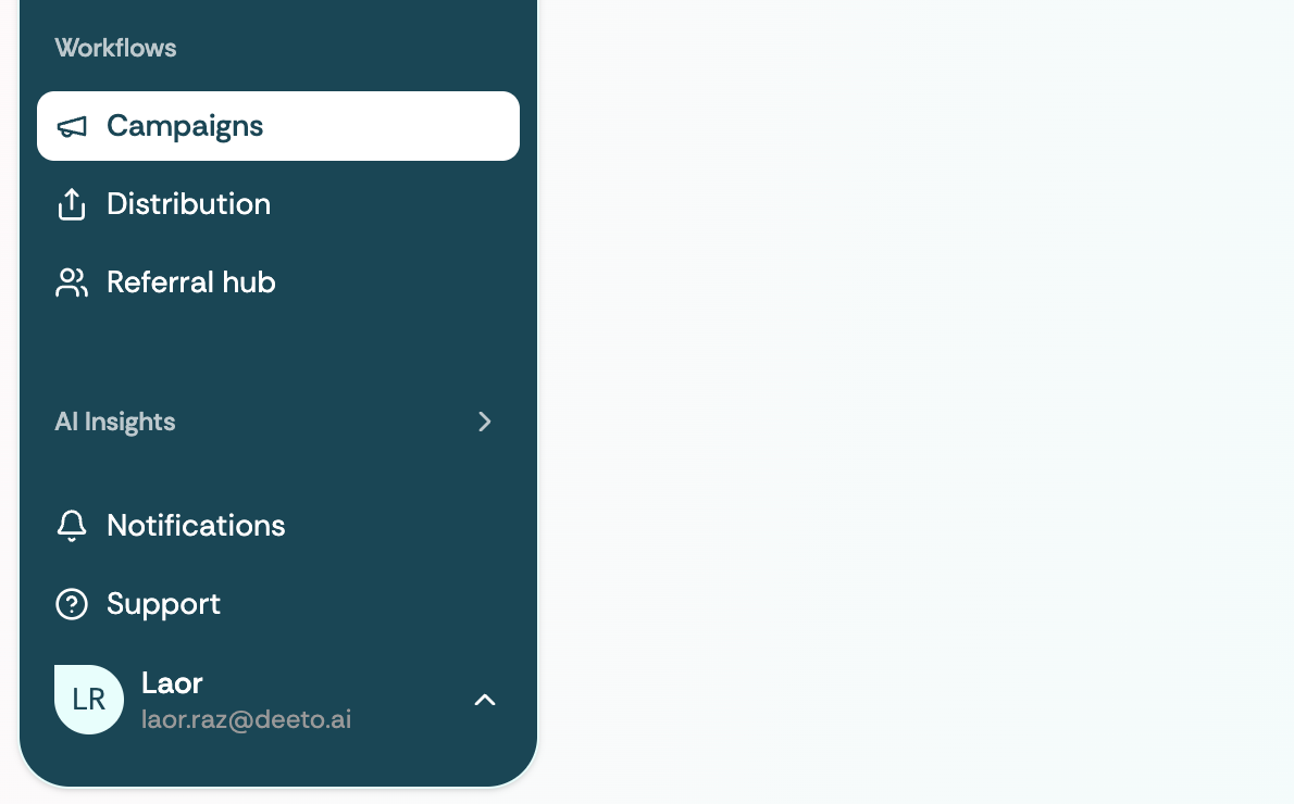 We've reimagined Deeto to put your customer intelligence at the center of everything. The new interface organizes your workflow into four intuitive sections: Pending Items (your daily command center), Prospect Hub (your sales cycle tracker), Knowledge Hub (your customer intelligence library), and Workflows (your campaign and distribution engine).